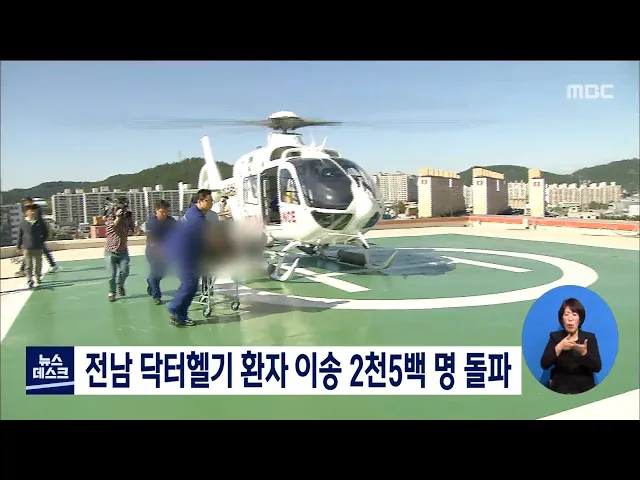 지난 2천11년 전국 최초로 도입한 전남 닥터헬기가 환자 이송 2천5백 명을 돌파했습니다. 전남닥터헬기는 도서벽지 등 취약지역 응급환자의 신속한 이송과 치료를 위해 119 상황실이나 의료기관 요청 때 전문의를 포함한 응급 치료진이 함께 탑승해 출동합니다.