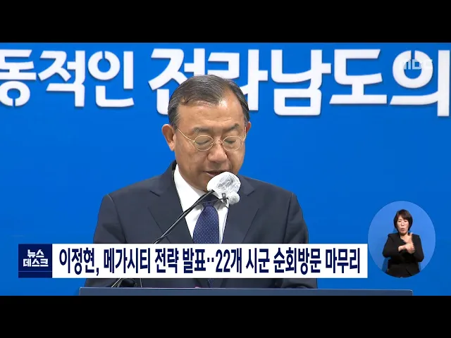 국민의힘 이정현 전남지사 후보가 핵심 공약인 전남 메가시티 전략을 밝혔습니다. 이정현 후보는 전남 22개 시군 전체를 하나의 거대한 도시로 묶는 전략이라며 특히 이차전지를 메가시티의 핵심으로 구축하겠다고 밝혔습니다. 앞서 이정현 후보는 전남 22개 시군 읍면동 순회 방문을 99퍼센트 마쳤으며, 마을회관이나 주...