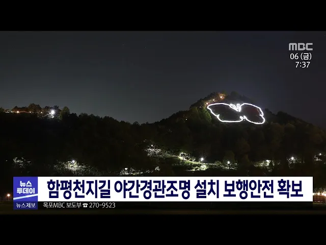 함평군은 최근 화양근린공원과 생태습지, 엑스포공원 등을 잇는 6km 구간의 '함평천지길'에 야간 경관조명을 설치하고 일몰 직전부터 밤 10시까지 조명을 켤 예정입니다. 함평천지길은 숲과 생태길, 공원길로 구성돼 지역주민들의 산책로로 이용되고 있지만, 야간조명이 설치되지 않아 불편을 겪어왔습니다.
