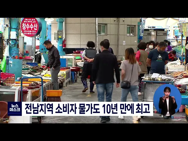 전국적인 물가 대란이 이어지는 가운데 전남의 소비자 물가도 기록적인 상승폭을 이어가고 있습니다. 호남지방통계청의 4월 물가동향에 따르면 지난달 지역의 소비자 물가는 전년 같은달에 비해 5.5% 포인트 상승해 5.9%포인트 인상률을 보였던 2011년 8월 이후 10년만에 최고를 기록했습니다. 체감물가를 반영한 생활물가...