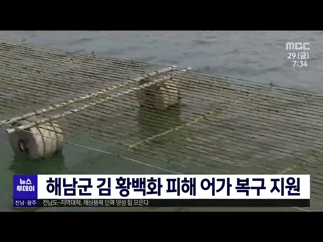김 황백화와 다시마 녹음 피해를 입은 해남군 해조류 양식어가 653세대에 4억7백만원의 피해복구비가 확정돼 해남군이 조기 지급합니다. 또 어업피해와 별개로 황백화 피해 물김 폐기 처리비 지원사업으로 해남군과 수협이 30억원을 들여 추진하는 한편, 어선임차료 2억원을 지원할 예정입니다. 해남지역의 해조류 양식어...