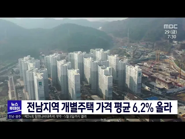 전남지역 올해 개별주택 공시가격이 전년보다 평균 6.23퍼센트 오른 것으로 나타났습니다. 시군별로는 담양군이 11.09%, 장성군 9.24%, 여수시 9.19% 순으로 상승률이 높았고, 도내 최고가 단독주택은 여수시에 소재한 주택으로 24억 원을 기록했습니다. 개별주택공시가격은 도내 시군 누리집과 부동산공시가격알리미에서 ...