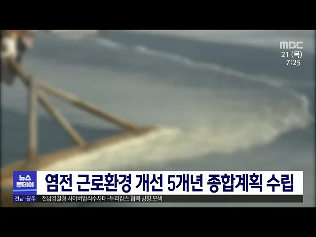 전라남도는 염전 근로환경 개선을 위해 노동착취 사전 예방 등 염전 근로환경 개선 종합계획을 추진합니다. 2016년까지 5년동안 추진될 종합계획은 염전 근로환경 개선 등 3대 중점 추진전략과 염전근로자 숙소 지원, 천일염 생산시설 자동화 기계 보급 등 14개 사업으로 이뤄졌습니다. 전라남도는 또, 염전근로자 처우개선...