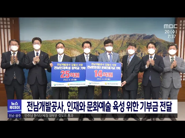 전남개발공사는 지역인재 육성과 문화예술 진흥을 위해 써달라며 전남인재평생교육진흥원과 전남도문화재단에 각각 25억원과 14억원의 기부금을 기탁했습니다. 전남인재평생교육원은 코로나19로 힘든 도내 학생들의 생활안정과 취업활동 지원을 위한 ‘희망전남 특별장학금’으로 기부금을 사용할 예정입니다. 전남문화재단도...