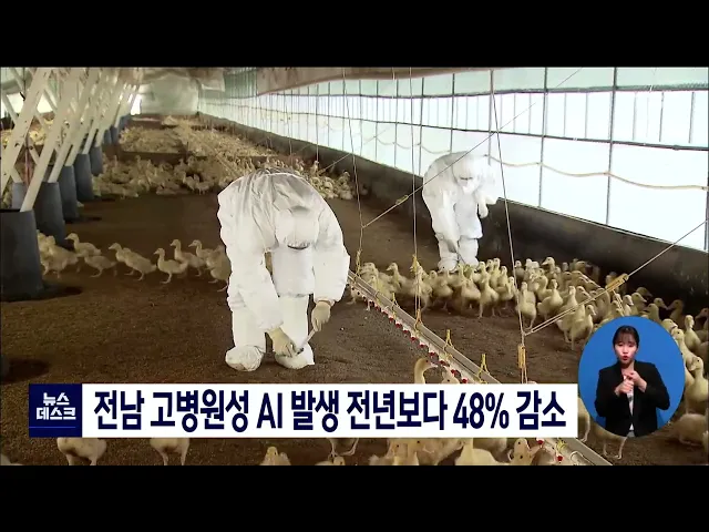 지난 겨울 고병원성 조류 인플루엔자 발생이 크게 감소했습니다. 전라남도는 발생 건수는 11건으로 전년보다 48% 줄었고 살처분도 380만여 마리에서 32만 마리로 90% 이상 감소했습니다. 전라남도는 지자체와 생산자단체, 계열사의 협력 체제로 선제적인 맞춤 차단방역이 성과를 거뒀다고 평가했습니다.