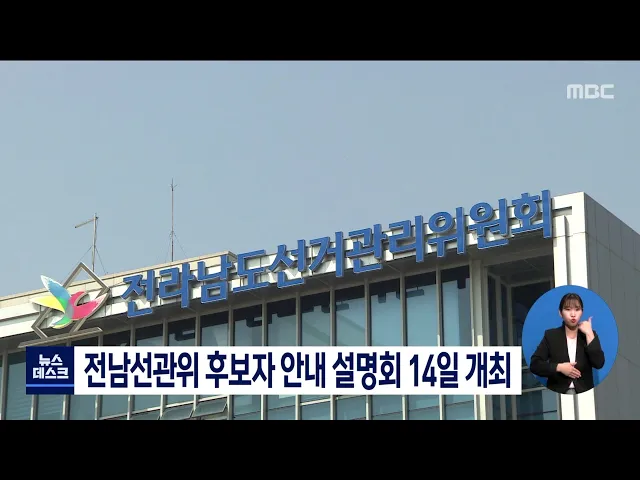 전라남도선거관리위원회가 오는 14일 오후 2시 선관위 대회의실에서 지방선거 후보자 안내 설명회를 개최합니다. 대상은 전남지사와 전남교육감, 비례대표 전남도의원 선거에 참여할 정당과 입후보 예정자, 선거 관계자 등으로 후보자 등록에 필요한 사항과 선거운동 방법, 제한˙금지되는 선거운동 등을 안내할 예정입니다...