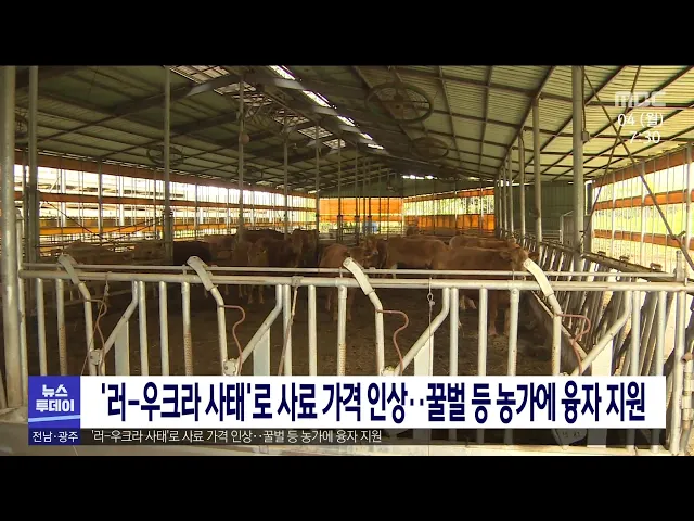 러시아-우크라이나 사태로 국제 곡물가격이 오르면서 배합사료 가격이 인상됨에 따라 전라남도가 도내 축산농가에 사료 구매자금 491억 원을 융자 지원합니다. 축종별 지원한도액은 한우, 젖소 사육농가는 6억 원, 돼지*가금 사육농가 9억 원, 꿀벌과 염소, 말 등 기타가축은 9천만 원으로 각 축산농가에서 필요금액을 시...
