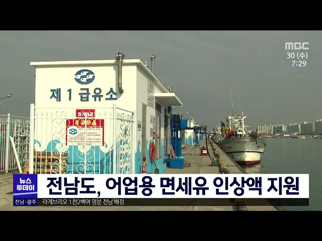 최근 기름값이 크게 오른 가운데 전라남도가 어업용 면세유 인상액을 지원하기로 했습니다. 전라남도는 어업인의 기름값 부담을 덜어주기위해 긴급 예비비 84억 원을 편성해 면세유 인상액의 50%를 3월부터 6월 말까지 넉달동안 지원한다고 밝혔습니다.