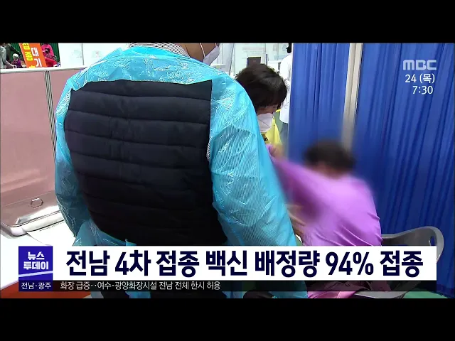 전라남도에 배정된 코로나19 4차 백신 배정량의 94%가 접종을 마쳤습니다. 전라남도는 지난달 4차 접종용 백신 4천492 바이알, 2만7천여 명 분 가운데 2만5천여 명을 접종을 마쳤는데 시군 보건소 간 배정량 재조정을 통해 백신 접종률을 높였다고 밝혔습니다. 전남지역 백신 접종률은 1차 90점1%, 2차 89점2%, 3차 72점1%...