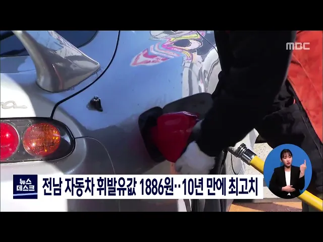 전남의 자동차 휘발유 평균 가격이 최근 10년새 최고치를 기록하고 있습니다. 한국석유공사 유가정보시스템을 보면 3월 10일 기준, 전남의 자동차 보통 휘발유 1리터 평균 가격은 1886원으로 집계됐고, 이는 1900원 선이었던 2013년 이후 최고치입니다. 경유 값도 1리터에 평균 1755원을 기록하고 있는 가운데 러시아의 우...