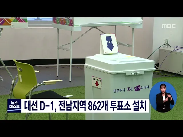 20대 대선을 하루 앞두고 전남지역 투표소 862곳과 개표소 22곳의 설치작업이 이뤄졌습니다. 전남선관위와 각 시군 선관위는 오늘 투표소 설치작업과 함께 투표지 분류기를 점검하는 등 투,개표준비에 만전을 기하고 있습니다. 내일 대선 투표는 오전 6시부터 오후 6시까지 진행되며 코로나19 확진자와 격리자들은 오후 6시...