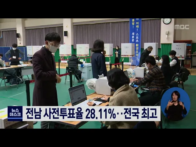 전남이 전국에서 가장 높은 사전투표율을 기록했습니다. 전남은 총 선거인수 158만1천여 명 가운데 오늘, 36만 8천여명이 사전투표를 마쳐 28.11%의 투표율을 기록했습니다. 전국 사전투표율은 평균 17%를 기록한 가운데 내일도 이틀째 사전투표가 이어집니다.