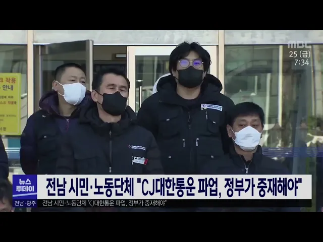 전남지역 시민·노동단체가 CJ 대한통운의 무책임한 대화 거부와 관련해 정부가 직접 중재할 것을 촉구했습니다. 전남시민단체연대회의와 전남진보연대 등 90개 단체는 오늘(24) 여수시청에서 기자회견을 열고 사측의 대화 거부로 CJ대한통운과 택배 노동자들의 갈등이 장기화되고 있다고 주장했습니다. 택배노조 CJ대한통...