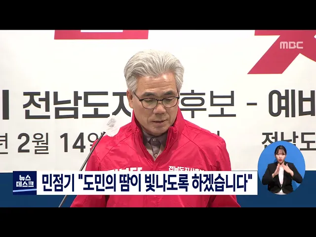 진보당 민점기 전남도지사 예비후보는 선관위 예비후보 등록을 마치고 기자회견을 통해 도민의 땀이 빛나도록 하는 본격적인 선거활동에 나서겠다고 밝혔습니다. 민 예비후보는 또, 농업대혁명과 청년이 머무는 전남 등 전남 5대 핵심사업을 발표하고 특히 산재예방활동을 본격화해 산재없는 전남을 만들 것을 강조했습니다...