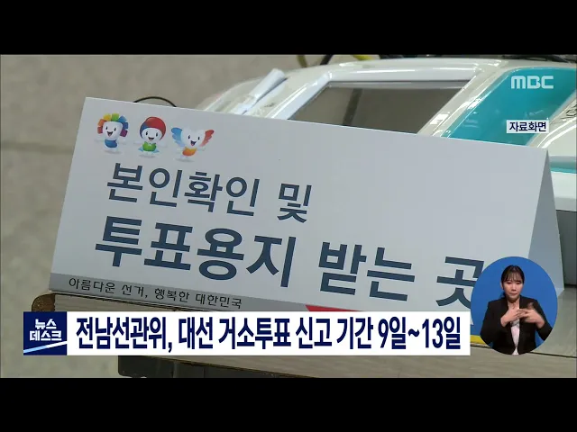 제20대 대통령선거 거소 투표 신고가 내일(9)부터 13일까지 진행됩니다. 대상은 장애로 거동이 불편하거나 병원, 요양원, 교도소 등에 수용된 유권자, 외딴 섬에 거주하는 유권자 등으로 신고서를 관할 지자체와 읍면사무소에 직접 또는 우편으로 제출해야 합니다. 전남선관위는 또, 원양어선과 외항선 등에 승선한 유권자...