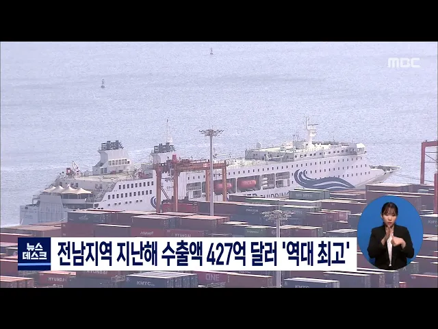 전남지역 지난해 수출액이 427억 달러로 사상 최고치를 경신했습니다. 2021년 전남 지역 최대 수출품은 석유화학제품으로 169억 달러를 기록했고, 석유, 철강, 농수산식품 제품 모두 증가세를 보이면서 전년보다 58% 증가한 427억 달러를 기록했습니다. 전라남도는 코로나19 상황에도 수출이 증가한 것이 고무적이라며 앞으...