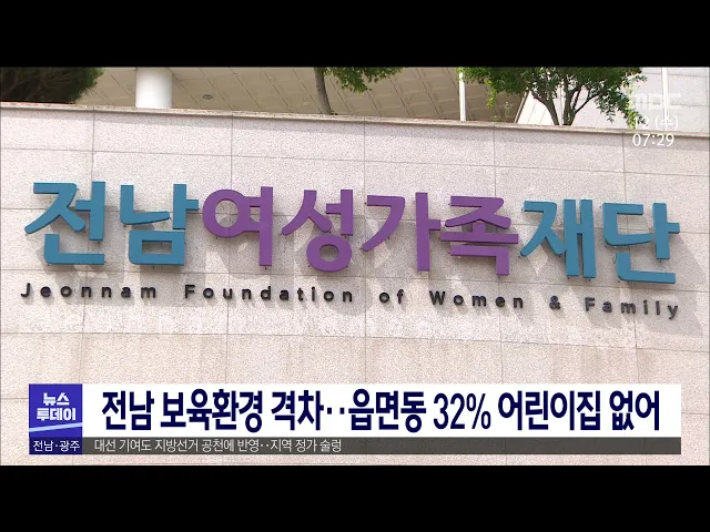 전남지역 보육환경 격차가 있다는 연구결과가 나왔습니다. 전남여성가족재단이 발간한 보육서비스 현황과 지원개선방안 보고서를 보면 전남 197개 읍면동 가운데 32%인 95개 읍면동에는 어린이집이 없고, 6개 지역은 유치원도 없는 상태였습니다. 여성가족재단은 교사대 아동 비율을 줄이고, 공공보육 확대, 취약보육 강화,...