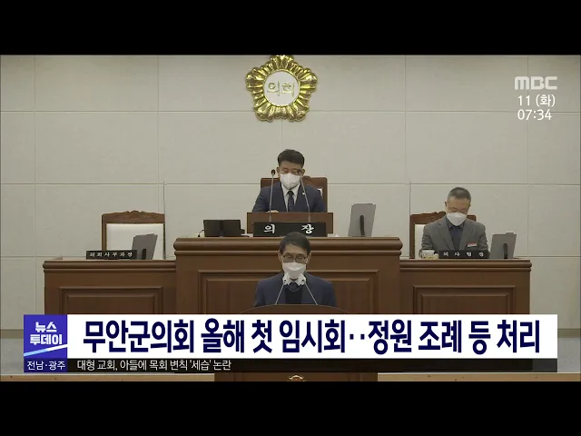 무안군의회가 상정된 조례안 등을 처리하기 위해어제(10), 올해 첫 원포인트 임시회를 열었습니다. 무안군의회는 지방의회 인사권 독립과 지역현안사업 수요에 따른 지방공무원 정원 조례 개정안을 비롯해지방의원 의정활동비 지급 등에 관한조례 개정안 등을 심의 의결했습니다.