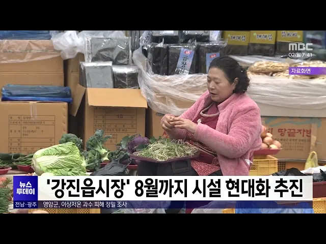 강진군이 오는 8월까지 강진읍시장을 대상으로시설 현대화 사업을 추진합니다.강진군은 시장 화장실 3곳 리모델링,전열 설비와 소방안전시설 조성 등을 통해전반적 환경을 개선하기로 했습니다.또, 종합동과 수산동 연결 통로를 정비하고 강진읍시장을 상징하는 조형물도 설치해쾌적하고 안전한 시장을 만든다는 계획입니다...