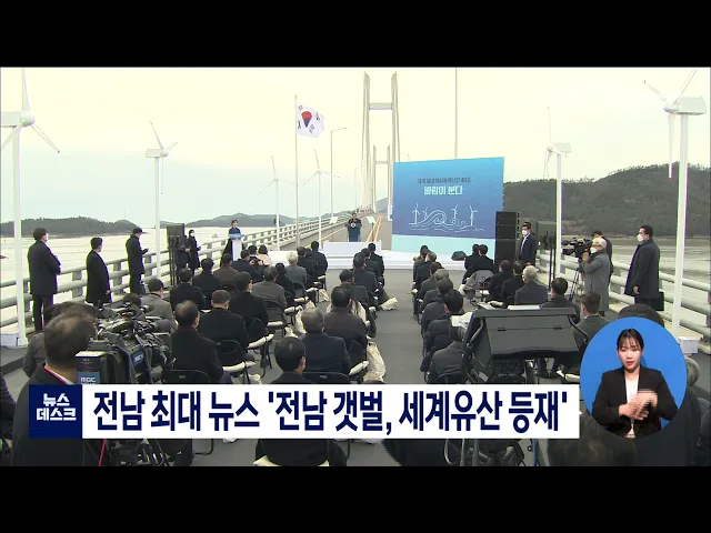 올해 전라남도 10대 뉴스 선정 설문 조사 결과 '전남 갯벌, 유네스코세계유산 등재'가 올해 최대 뉴스로꼽혔습니다. 전남 갯벌 세계유산 등재는설문 응답자의 43점4%가 선택했으며2위는 '세계 최대 해상풍력으로한국판 뉴딜 선도'가 ,3위는 '국립한국섬진흥원 유치 쾌거'가각각 선정됐습니다.