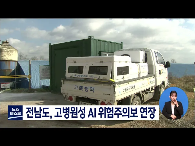 전라남도가 고병원성 조류인플루엔자위험주의보를 내년 1월 22일까지 연장하고현장 방역 활동을 강화하기로 했습니다. 도는 내년 1월 말까지 예상되는 한파와 폭설로 닭,오리농장에서 소독을 소홀히 할 우려가 높고 최근 전북 오리농장에서 고병원성 AI 의심 사례가 발생하는 등확산 가능성이 커져 위험주의보를 연장했다...