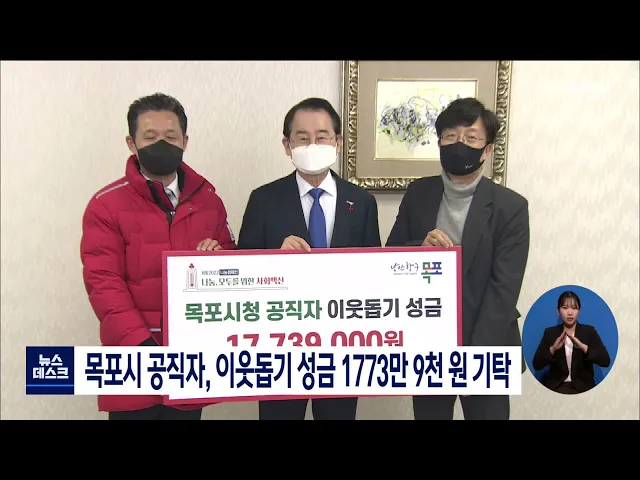 목포시청 공직자들이 목포MBC를 찾아 희망 2022 나눔캠페인 이웃돕기 성금으로 모은 1773만 9천 원을 전남사회복지공동모금회에 기탁했습니다. 목포시는 지난 6일부터 9일동안 전체 공직자를 대상으로 모금 활동을 이어왔으며, 1206명이 성금 모금에 참여했습니다.