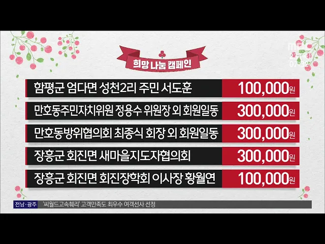오늘의 간추린 소식입니다.한국미술협회 목포지부 신임회장에취임한 윤석수 화백은 목포미술협회를 최고의 미술단체로 만들고 국제수묵비엔날레 성공을 위해 노력하겠다고 밝혔습니다.----------장흥초등학교 1학년 전교생이나눔장터를 통한 수금익 85만 5천 원을기탁한 것을 비롯해 연말연시를 맞아 장흥군에 지역사회 기...