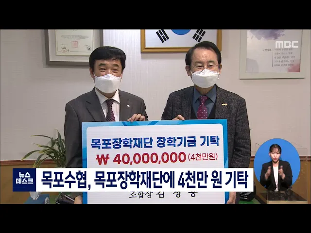 목포수협이 목포장학재단에 장학금 4천만 원을 기탁했습니다. 목포수협은 목포수산물유통센터 활어위판장 운영 수익금 일부를 지역사회에 환원하는 차원에서 장학금을 마련했습니다. 목포수협은 활어위판장을 단독 운영체제로 전환한 지난 2016년 이후 지금까지 목포장학재단에 총 2억 4천만 원을 기탁했습니다.