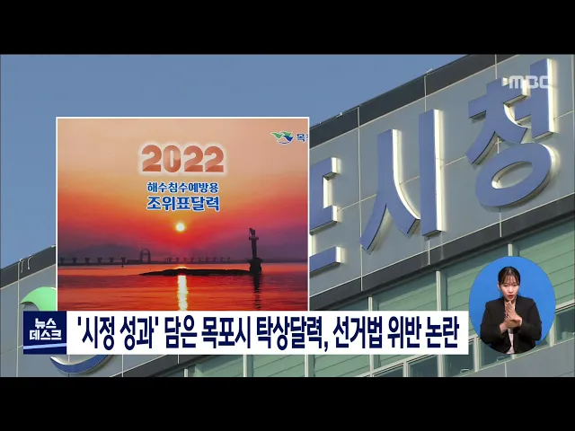 목포시청 하수과가 제작한 새해 탁상달력에 김종식 시장의 인사말이 게재돼 선거법 위반 논란이 일고 있습니다. 목포시 하수과는 바닷물 조위표를 담은 새해 탁상달력 1200부를 예산 7백여만 원을 들여 제작했는데, 김종식 시장의 사진과 함께 성과사업 등이 명시된 인사말이 달력 안에 포함됐습니다. 목포시는 \"일상적 달...