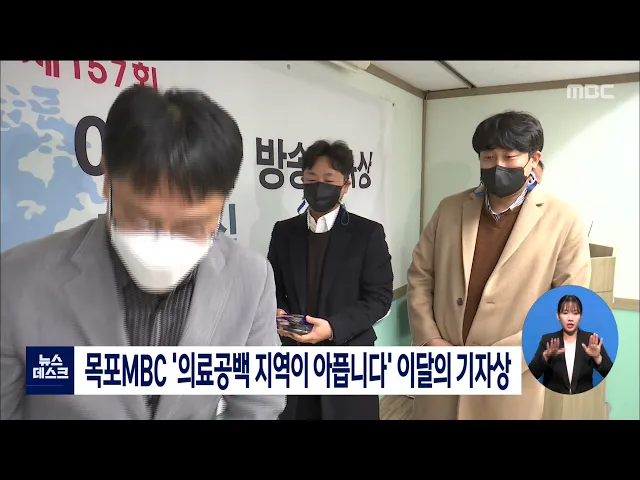 목포MBC 양현승, 정상철, 홍경석 기자가제작한 다큐멘터리 '의료공백 ,지역이 아픕니다'가 방송기자연합회의 제157회 이달의 방송기자상을 수상했습니다.목포MBC 다큐멘터리 '의료공백_지역이 아픕니다'는국내 지역별 의료격차와 농어촌 공공의료기반 붕괴 현실, 대책 등을 심층적으로담아냈다는 평가를 받았습니다.
