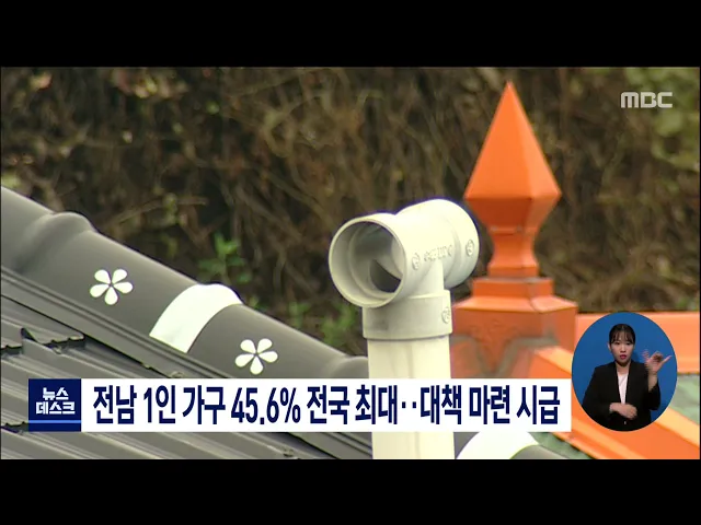 전남지역 1인 가구가 급증하면서관련 대책 마련이 시급합니다.지난달 말 기준 전국 1인 가구는936만 7천 세대로 전체 새대의 40.1%를차지하고 있는데전남 1인 가구는 전체 가구의 45.6%로전국에서 가장 높은 것으로 드러났습니다.전남도의회 최선국 의원은급속한 가족 형태 변화에도 전남여성가족재단의 정책연구가 전무하...