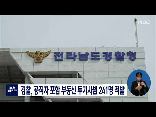 부동산 투기로 이득을 취한 수백여명이 경찰에 적발됐습니다. 전남경찰청은 지난 3월부터 부동산투기사범 특별수사대를 운영해 내부 비밀을 부정하게 이용하거나 불법 전매 등을 한 241명을 적발하고 이가운데 5명을 구속했습니다. 이번에 적발된 투기 사범 가운데는 공무원 25명과 공공기관 종사자 2명도 포함됐습니다.