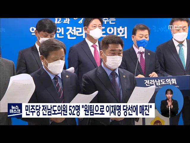 더불어민주당 소속 전남도의원들이 \"이재명 대통령 후보의 당선을 위해 원팀으로 뭉치겠다\"고 선언했습니다. 전남도의원 52명은 오늘 기자회견을 열고, \"이재명 후보를 당선시킴으로써 정권재창출과 함께 연방제에 준하는 지방분권을 이뤄내겠다\"며 \"도의원으로서 모든 기득권을 내려놓고 이재명 후보의 당선을 위해 ...