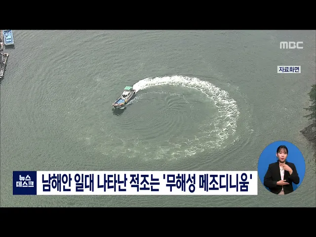 국립수산과학원은고흥군 나로도와 여수시 돌산도 동쪽 연안,경남 남해군 연안 일대에서 관측된 적조는'무해성 메조디니움'이라고 밝혔습니다.국립수산과학원은무해성 메조디니움 적조는 당분간 지속되겠으나 장기간 유지되지 않을 것으로 예상했습니다.