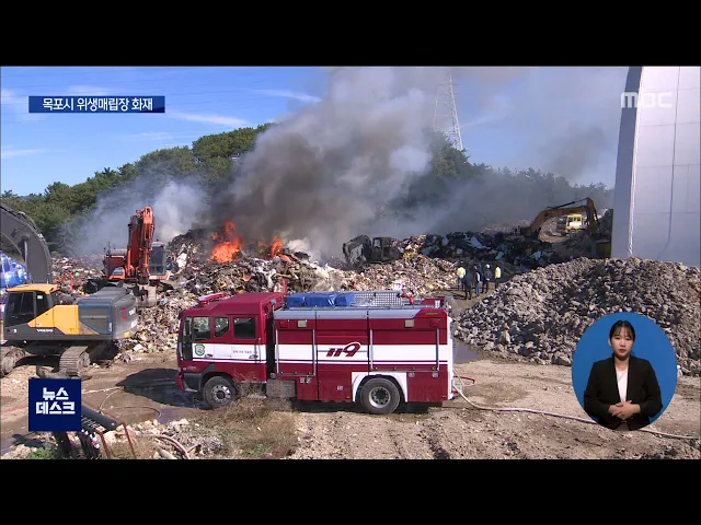 ◀ANC▶목포시 위생매립장의 폐기물 더미에서화재가 발생했습니다.불은 본 현장 관계자들이 10분 정도자체진화를 하다 뒤늦게 119에 신고했습니다.김안수 기자가 취재했습니다. ◀END▶검게 탄 쓰레기 더미에서하얀 연기가 솟아 오릅니다.쉴새없이 물을 뿌려보지만 역부족...중장비는 뼈대만 남고 검게 타버렸습니다.목...