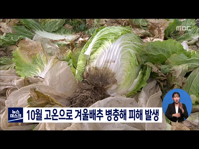 겨울배추 주산지인 해남지역 등에서 10월 고온현상으로 병해충 피해가 발생하고 있습니다. 해남군에 따르면10월 중순까지 30도를 웃도는 고온현상이이어지면서 해남지역 배추재배 면적의 10%가량에서 배춧 잎이 물러지는 무름병과 뿌리혹병 등이 발생했습니다. 해남군은 최근 기온이 하락하면서 배추 병해충 피해가 진정되...