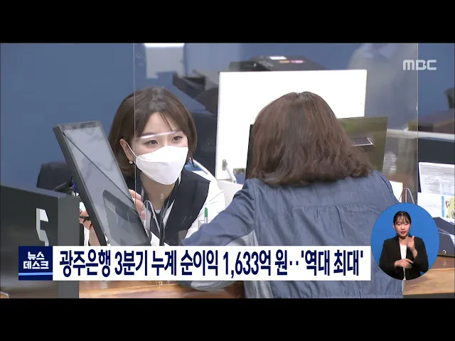 광주은행이 올해 3분기까지 역대 최대의 경영실적을 올렸다고 밝혔습니다.광주은행은 올해 3분기 누계 당기순이익이 1,633억원으로, 전년 동기 대비 18.6%가 증가했다고 밝혔습니다.또 총영업이익은 지난 해 같은 기간과 비교해 290억 이상 늘었다고 덧붙였습니다.광주은행은 4분기 남은 기간 동안 소상공인 지원 확대와 건...