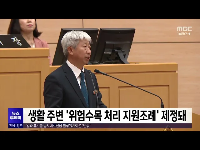 박형대 도의원이 대표발의한 전라남도 생활주변 위험수목 처리지원 조례안이 지난 전남도의회 임시회에서 통과돼 신속하고 체계적인 관리가 가능할 전망입니다.이번 조례안은 태풍, 폭우 등 자연재해로 인해 생활주변 나무가 쓰러지거나 부러져 도민의 생명과 재산에 피해가 발생하는 사례가 반복됨에 따라 위험수목을 체계...