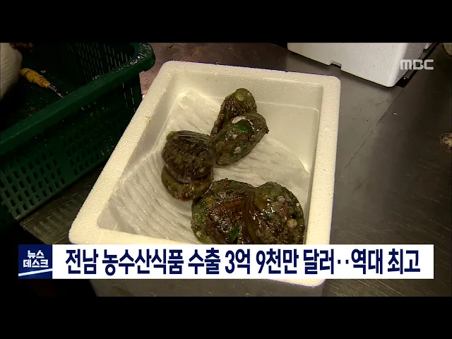 올해 전라남도의 농수산식품 수출액이 3억 9천만 달러를 기록하면서 역대 최고 실적을 달성했습니다. 국가별로는 미국이 8천 4백만 달러를 최고로 중국, 대만 등의 순으로 이어졌으며 품목별로는 김, 전복 등 수산물과 분유와 오리털 등 축산물의 판매가 늘었습니다 전라남도는 온라인 플랫폼인 아마존 브랜드관 확대, 미...