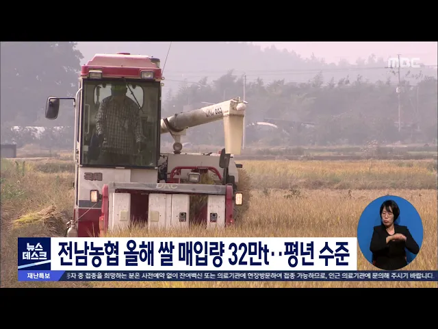 올해 전남농협은 32만 톤의 쌀을 수매할예정입니다. 전남농협의 올해 쌀 매입량은 평년 수준인 32만t으로 도내 생산량의 45% 안팎이며,공공비축은 12만t을 매입할 예정입니다. 지난 8일 통계청은 올해 전국 쌀 생산 예상량을 지난해보다 32만t 증가한 382만t으로 발표했습니다.///