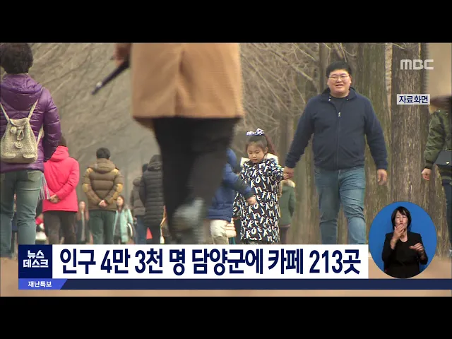 인구 4만3천여명인 담양군의 카페가 213곳인 것으로 나타났습니다. 도내 17개 군 지역 중 가장 많은 담양군의 카페 수는인구 200명 당 1개꼴로메타세쿼이아 길을 중심으로 조성된 메타프랑방스, 죽녹원, 관방천 등 담양읍에집중돼 있습니다. 담양군의 관광객은 지난해 407만여명, 올들어 9월까지 240만여 명에 이르고 있습...