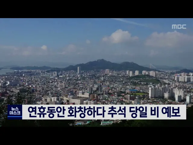 전남 지역은 연휴동안 화창한 날씨를 보이다 추석 당일(21)비가 내리겠습니다. 연휴기간 대체로 맑고 낮과 밤의 일교차가 10도 안팎으로 크겠으며, 추석 당일에는 아침(21)에는 전남 전역에 많게는 100mm가 넘는 비가 예보됐습니다.///