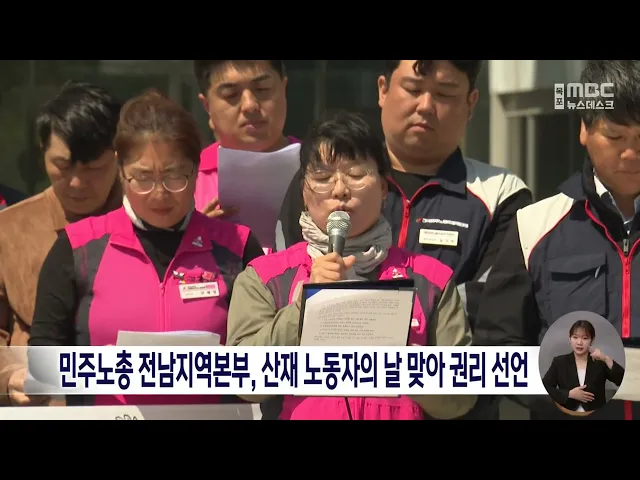 세계 산업재해 노동자의 날인 오늘(28)민주노총 전남지역본부가 그 의미를 되새기며 노동자와 시민의 뜻을 모은 4.28 산재 노동자 권리 선언을 발표했습니다.이들은 전남도청 앞에서 기자회견을 열고,"중대재해기업처벌법이 제정된 지 3년 동안 15건의 재판 중 단 1건만이 실형에 처해졌다"고 밝히며,"비정규직과 하청, 특...