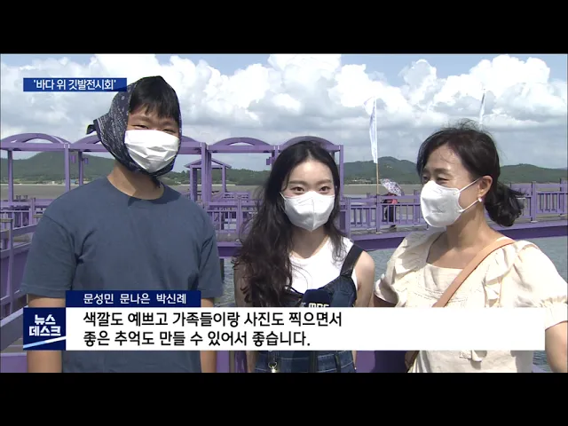 ◀ANC▶ 신안군의 이색적인 관광지,퍼플섬에서 시화전이 열리고 있습니다. 바다 위를 천천히 걸으면서시와 그림 100여 점을 감상할 수 있습니다.김안수 기자가 다녀왔습니다. ◀END▶ 신안군 반월, 박지도를 연결하는보랏빛깔 다리, 퍼플교. 다리 위에는 120개의 깃발이바닷바람에 힘차게 펄럭입니다. 이색적인 볼거리에...