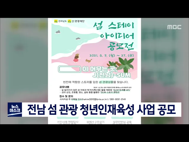 전라남도와 전남관광재단이 청년 섬 관광기획자를 키우는 '청춘어람 육성사업'에 나섭니다. ‘청춘어람 육성사업’은 청년이 만드는 어촌관광의 요람을 뜻하는 것으로 사업의 첫 단계로 오는 27일까지 전남에서 거주하는 만 18~39세 청년을 대상으로 '섬 스테이 아이디어 공모전'을 진행합니다. 공모전에 선발된 청년은 전남...