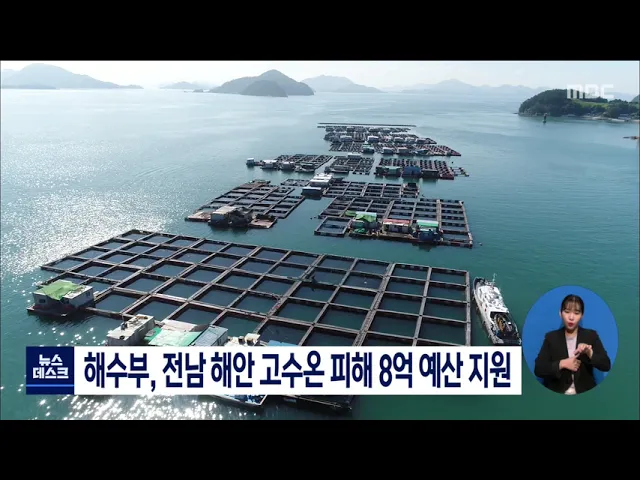 해양수산부가 고수온 피해가 발생한남해안 일대 가두리 양식 어가에8억원의 예산을 지원하기로 했습니다. 이번 예산은 고수온 피해가 확산하는 것을 방지하기 위해, 산소공급기와 차광막 등 고수온 대응 장비 구입 지원에 사용될 예정입니다.