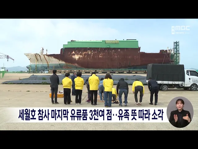 세월호 거치 현장에 보관 중인마지막 유류품 3천여 점이 유가족 뜻에 따라 소각 절차를 밟습니다.해양수산부는 오늘(23) 낮 목포신항에서 유가족들이 참석한 가운데 유류품 소각 전참사 희생자들을 위한 추모문 낭독과 상차림, 분향 등 추모의식을 진행했습니다.마지막으로 남은 유류품 3천45점은 모두 주인을 알 수 없는 ...