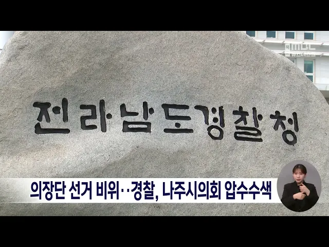 전남경찰청 반부패경제범죄수사1대는오늘(23) 뇌물수수 등 혐의로 입건된 나주시의회 의원들 사무실과 주거지 등을 압수수색했습니다.이들 10명은 지난 2022년 의장단 선출 과정에서의장으로 뽑아주는 대가로 천만 원 상당 금품을주고받은 혐의로 입건됐으며경찰은 추가 증거물 확보를 위해 세 번째 압수수색을 실시했습니...