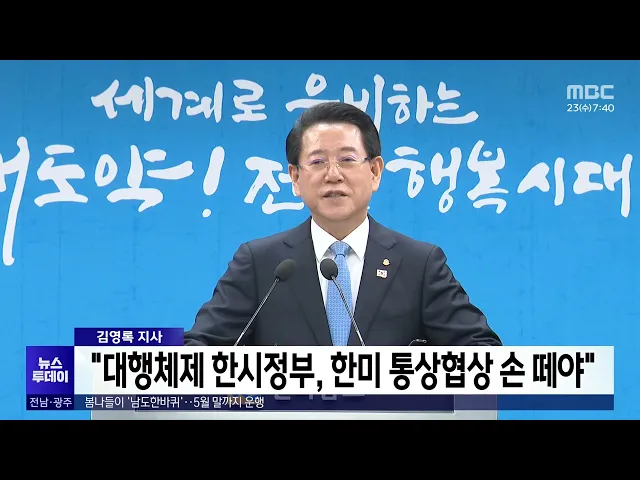 김영록 전남도지사가 오는 24일 최상목 경제부총리가 참여하는한미 통상협의와 관련해 "대행체제는 협상에서 손을 떼라"고 일갈했습니다.김 지사는 "내란에 대한 사법적 심판 대상자들이 대미 통상협상에 함부로 손을 대는 것은 국격과 국익을 심각하게 손상시키는 일"이라며 이같이 주장했습니다.특히 "서둘러 성과를 내려...
