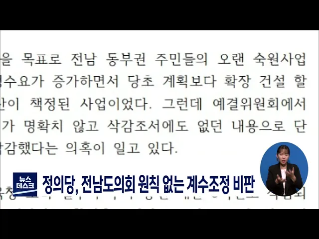 정의당 전남도당이전남도의회 예산결산특별위원회의 원칙없는계수조정을 비판하고 나섰습니다.정의당 전남도당은전남도의회 예결위가 증액을 마음껏 해놓고계수 균형이 맞지 않자 삭감조서에도 없던전남도청 동부권 통합청사 건립 예산 5억 8천만원을 삭감했다는 의혹이 있다고주장했습니다.또 상임위원회를 통해 조정된 추...
